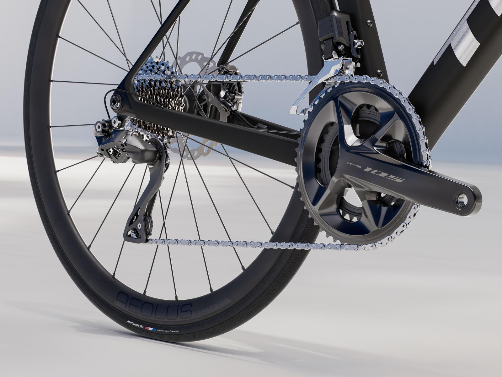 Einen ultraleichten Rahmen aus 500 Series OCLV Carbon mit aerodynamischem Profil und innovativer IsoFlow-Komforttechnologie. Eine präzise elektronische Shimano 105 Di2 2x12-Schaltung mit Technologien aus höher angesiedelten Gruppen und schlauchlose Bontrager Aeolus Elite 35 Carbonlaufräder.