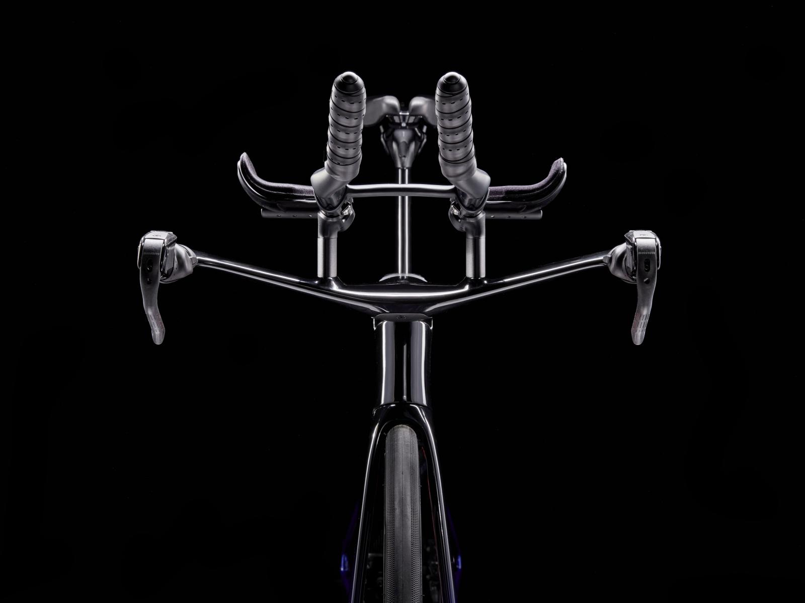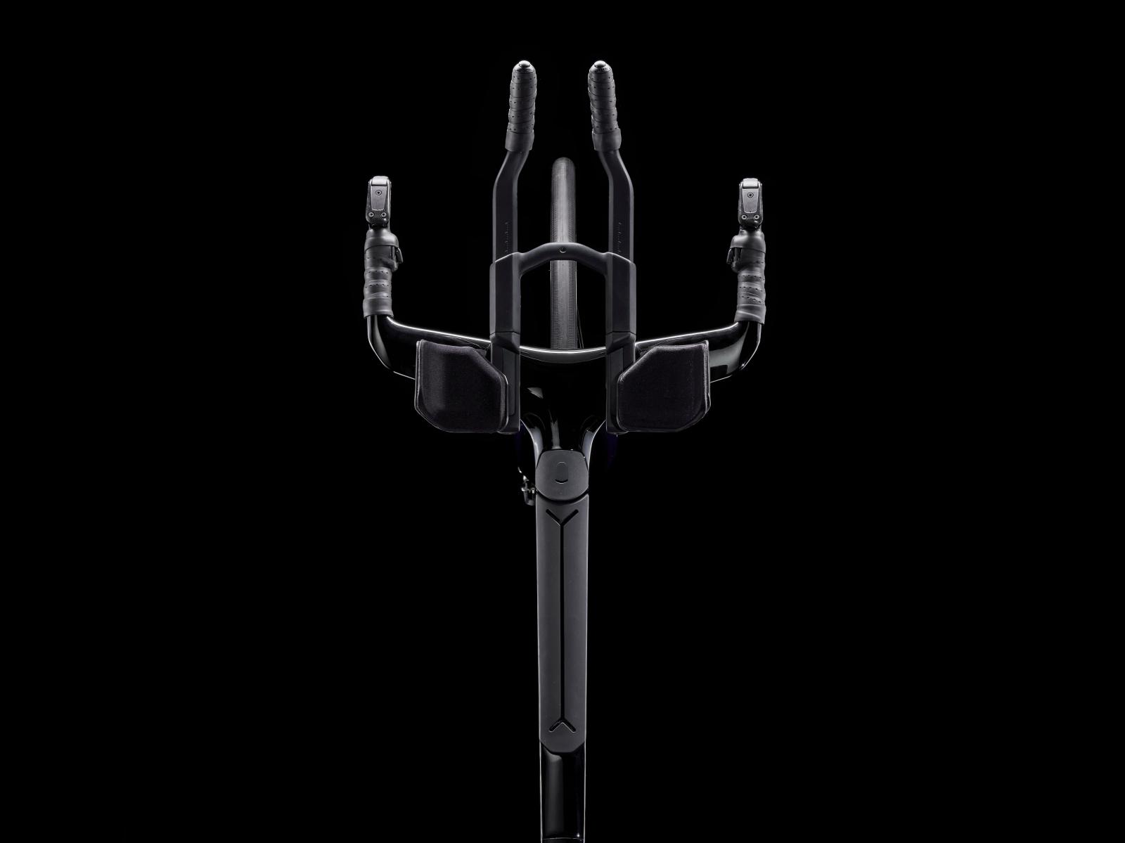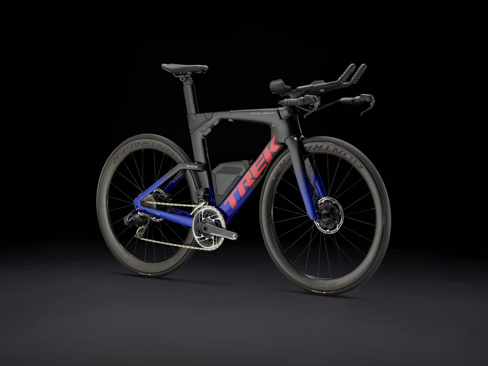 Einen ultraleichten Rahmen aus 800 Series OCLV Carbon, windschnittige Rohre mit Kammtail Virtual Foil-Profil (KVF), eine Speed Concept-Carbongabel mit aerodynamischem Profil, straßenglättendes IsoSpeed, integrierte Aufbewahrungslösungen für Verpflegung, Flüssigkeit und ein Pannenkit, einen drahtlosen elektronischen SRAM RED AXS 12fach-Antrieb mit SRAM AXS Blips-Schalthebeln, einen SRAM RED AXS-Powermeter, einen vollständig integrierten Lenker samt Vorbau, einen triathlonspezifischen Bontrager Hilo Pro-Carbonsattel für eine aggressive Aero-Sitzposition, zuverlässig zupackende Scheibenbremsen und aerodynamische Bontrager Aeolus RS