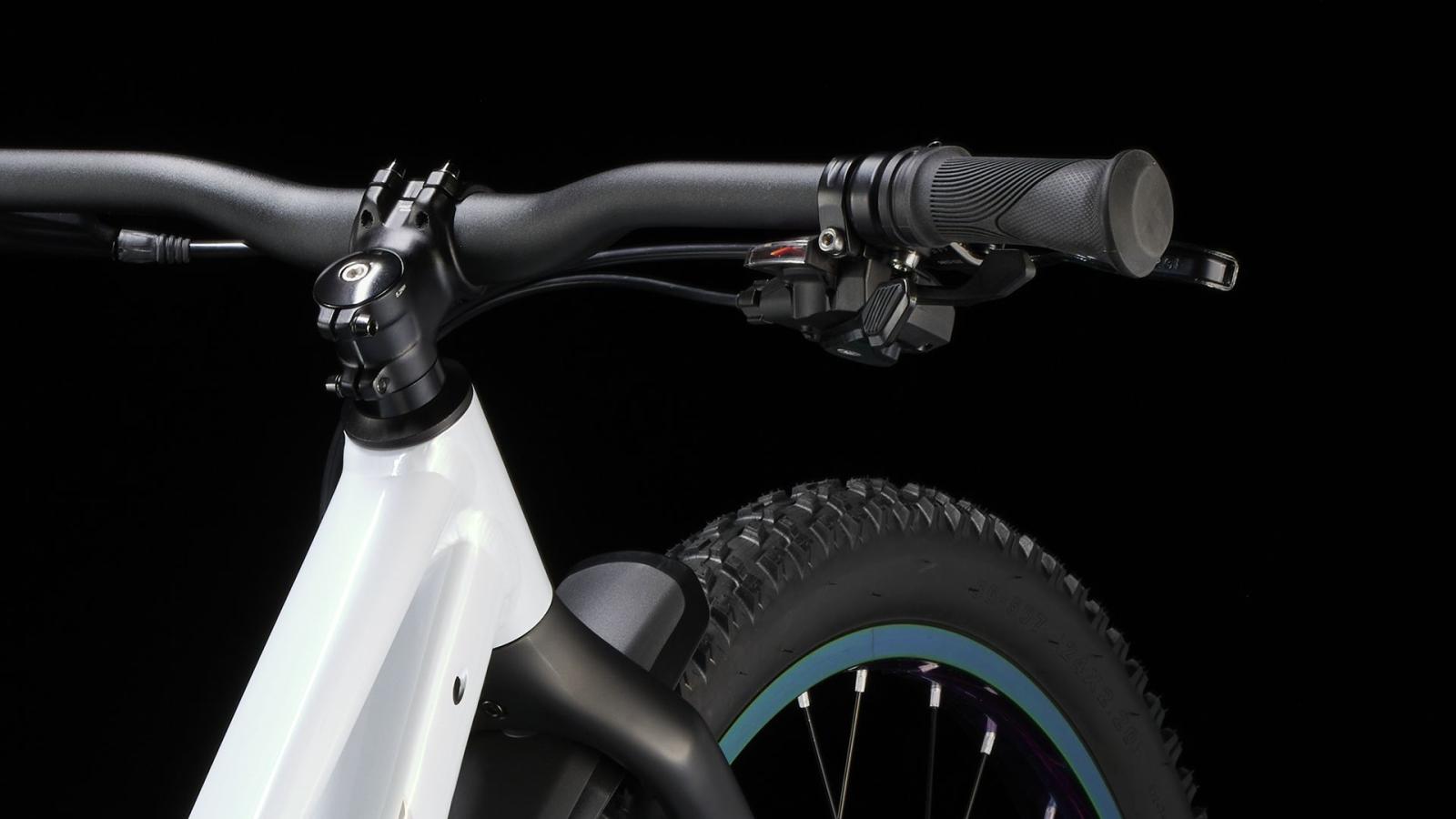 Einen Rahmen aus Alpha Silver Aluminium mit 24 Zoll großen Laufrädern und griffigen, 2,4 Zoll breiten Stollenreifen, die sich im Untergrund festbeißen und ein Plus an Traktion bieten. Dazu gibt es eine speziell auf Kinderbedürfnisse zugeschnittene Ausstattung, wie etwa die intuitive 9-Gang-Schaltung von microSHIFT und die kraftvoll zupackenden hydraulischen Scheibenbremsen.